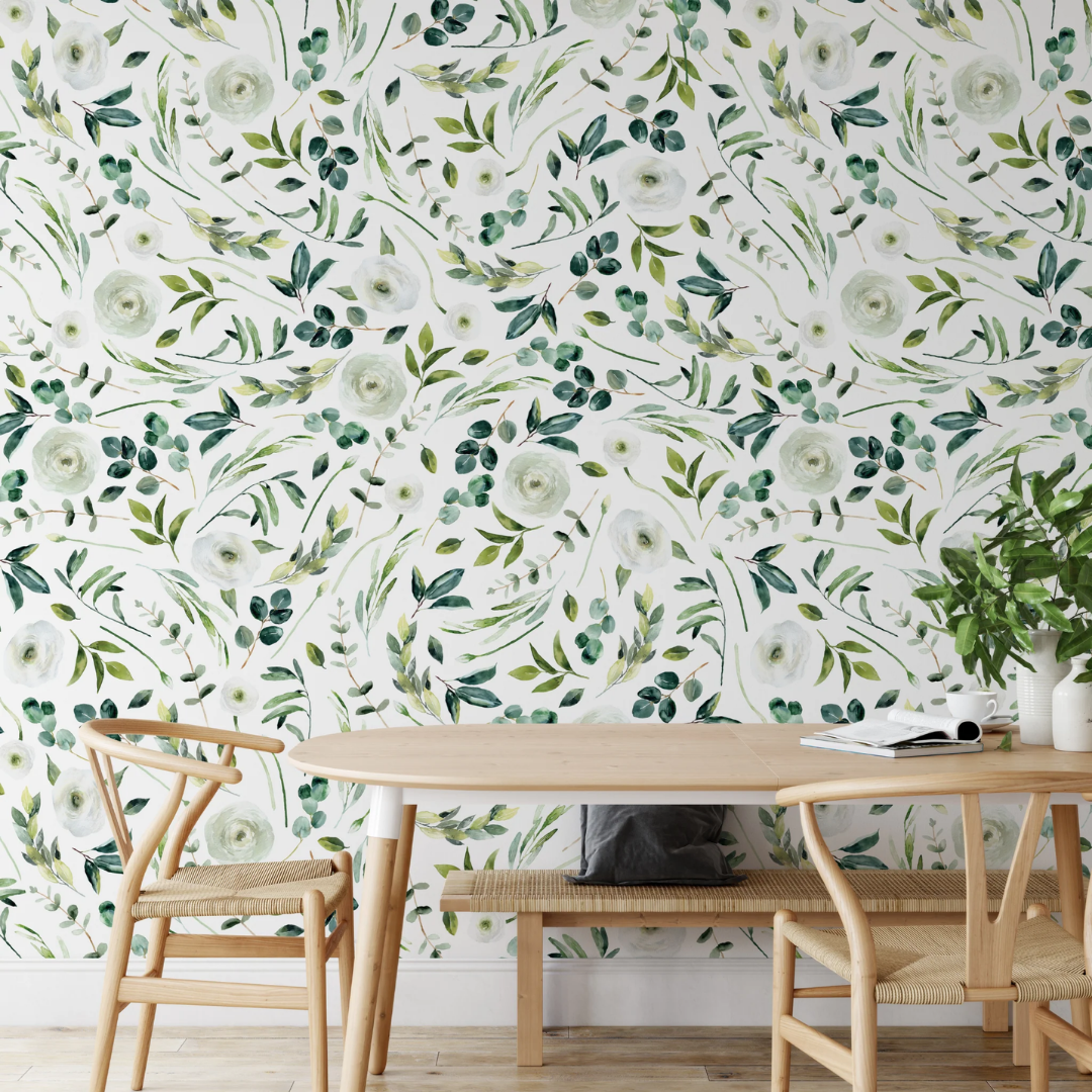 "Wall Blush's Green Valley Wallpaper in a Scandinavian dining room, highlighting floral patterns as the focal point.""Wall Blush Green Valley Wallpaper with floral pattern, perfect for freshening up a living room space."
