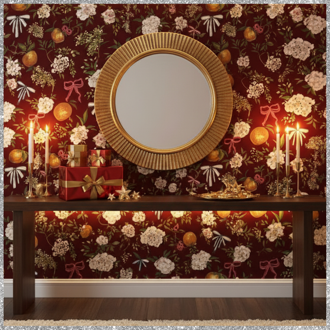 From bold red patterns to shimmering textures, these wallpapers bring a touch of drama and elegance to any space — perfect for dining rooms, entryways, or anywhere you want that festive glow to linger.