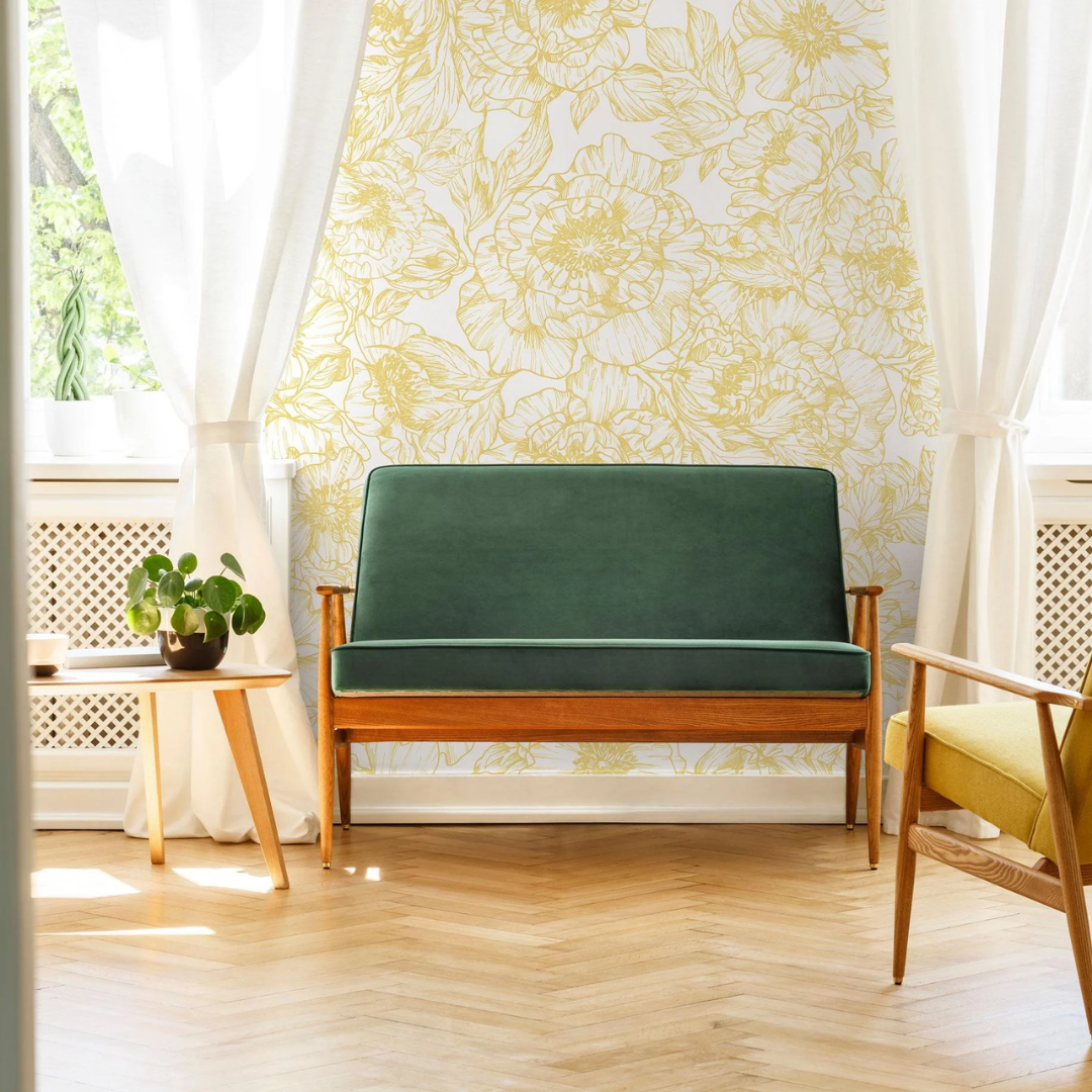"Flora Wallpaper by Wall Blush in Cozy Living Room with Vibrant Botanical Design Focus"Vibrant Flora Wallpaper by The Stefanie Bloom Line in a modern living room, highlighting elegant wall design.