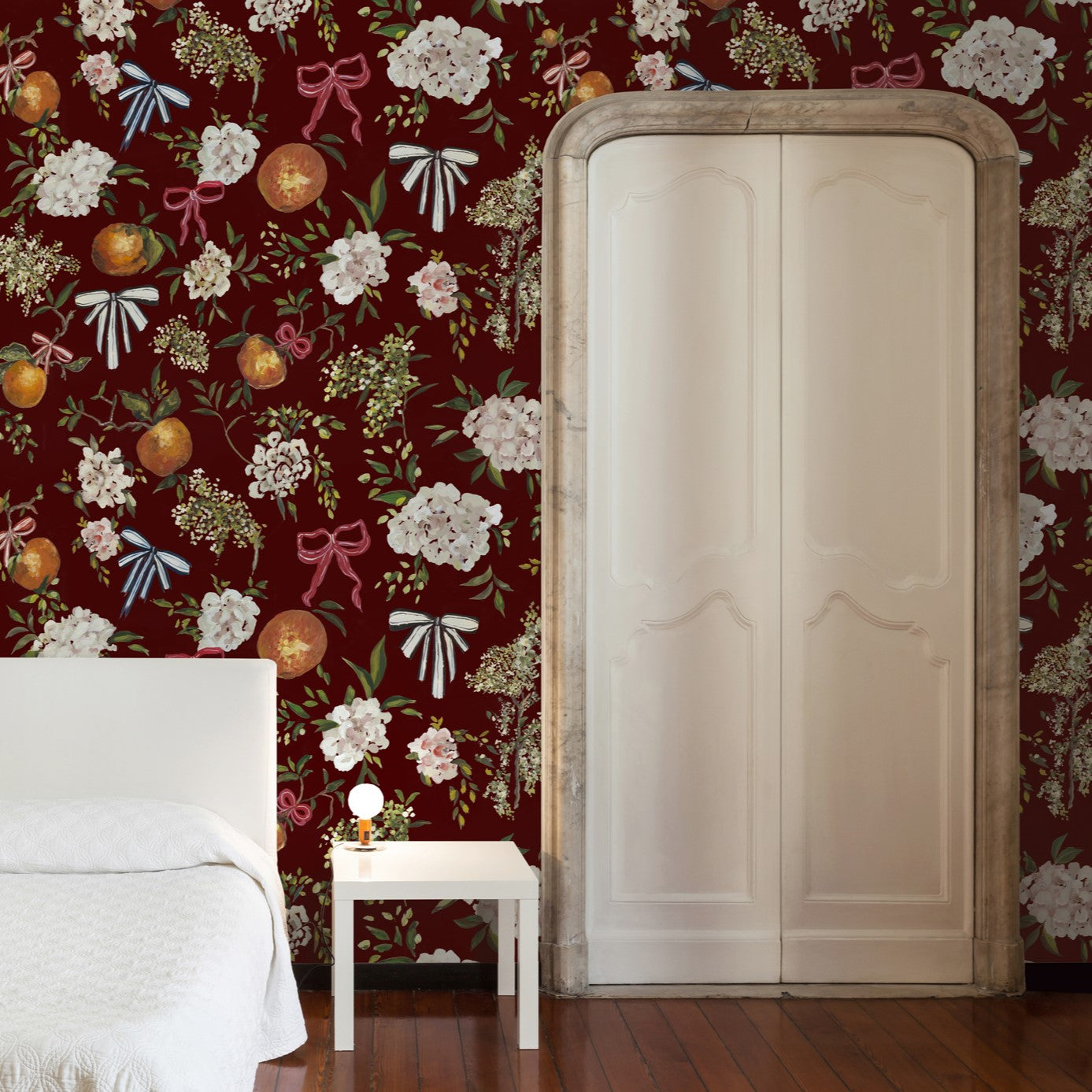 Daphne Wallpaper by Wall Blush SM01 in a stylish modern bedroom focusing on the floral wall design.